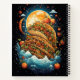These tacos are out of this world! Three stacked tacos stuffed with lettuce, tomato, and cheese float in space against the backdrop of a big cheesy moon surrounded by tomatoes, clouds, and stars. It's a dream come true for taco lovers.