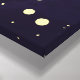 A canvas print with a dark blue background with yellow stars scattered around. Layered over top is an illustration of a spaceman wearing a white astronaut suit floating above the moon. Off in the distance is a planet with rings and a rocket ship flying off into the sky looking for new worlds to explore.