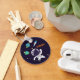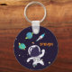 A personalised keychain with a dark blue background with yellow stars scattered around. Layered over top is an illustration of a spaceman wearing a white astronaut suit floating in space. Off in the distance are planets with rings and a rocket ship blasting off to places unknown.