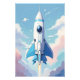 A sleek spaceship glides effortlessly through the azure expanse of the blue sky, its blue and white design catching the sunlight with every graceful manoeuvre. Against the serene backdrop, the vessel's advanced design stands out, creating a striking contrast with the endless horizon.