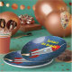 Cool Red and Silver Space Ship with its engines blasting it into space, passing by the Moon . Personalise with your text, for most any celebration. Great for kids of all ages.