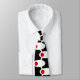 This necktie has a mid-century modern design of white ovals with red circles connected by white lines on a field of black. Want different colours? Message me.
