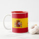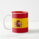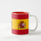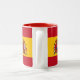 The national flag of Spain wraps around the mug, but instead of having one coat of arms, there are three which are equispaced around the mug.