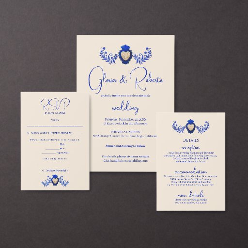 Elegant and simple Blue And Champagne Milagro Heart Mexican Wedding All-in-One Invitation in Spanish. Presenting our elegant Champagne Colour Mexican Wedding All-in-One Invitation, designed to capture the romance and cultural richness of a traditional Mexican wedding. This exquisite invitation features a stunning cobalt blue Mexican milagro heart, a symbol honouring Mexican colonial traditions. If you're dreaming of celebrating your wedding in a charming Mexican colonial town or simply want to embrace this enchanting theme, this design is the perfect choice.