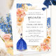Delight your guests with this beautiful quinceañera invitation in Spanish with delicate royal blue watercolor stains, exquisite floral elements and beautiful detail with quinceañera in royal blue dress. Same invite also available in English. Elegant invitation with modern hand written calligraphy elements, and floral frame in blush pink, peach and cream, champagne tones. Ability to add ceremony and reception details. Unique back with soft watercolor stains and on quinceañera on the centre with glittery stars. Same invitation in navy blue and in light blue also available.