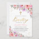 Modern, elegant girl Bautizo Invitation featuring pink & bright purple floral arrangements , elegant gold cross, typography script Baptism in trendy lettering. To edit this template click customise further.