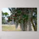 "Spanish Moss and American Holly" by Catherine Sherman. The American Holly and Spanish Moss, two plants native to the American southeast, are entwined in a park in South Carolina. The American Holly, Ilex opaca, flashes its showy red berries, while draped with the flowering plant, Spanish Moss, Tillandsia usneoides. Holly is a popular winter Christmas and holiday season decoration. In English poetry and English stories the holly is inseparably connected with the merry-making and greetings which gather around the Christmas time. The custom is followed in North America, and holly and mistletoe are widely used for decoration of homes and churches. The European Holly is smaller than the American Holly, but closely resembles the American Holly. The leaves of both species are similar in outline and toothed and bristled very much the same way, but the leaves are brighter in the American Holly and a bit larger Spanish Moss's specific name usneoides means "resembling Usnea", and it closely resembles its lichen namesake Usnea, also known as beard lichen, but in fact Spanish moss is neither a moss nor a lichen. Instead, it is a flowering plant (angiosperm) in the family Bromeliaceae (the bromeliads) that grows hanging from tree branches in full sun or partial shade. The plant has no aerial roots and its flowers are tiny and inconspicuous. It propagates both by seed and vegetatively by fragments that blow on the wind and stick to tree limbs, or are carried by birds as nesting material. Spanish Moss is very common in the American South, hanging from live oak trees and many other kinds of trees.