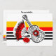 Whimsical design drawn in a retro style featuring souvenirs from a Spanish holiday; a wrought iron guitar, lacy fan and red rose on a striped background. A customisable design in black, white, red and golden yellow for you to personalise with your own text, images and ideas. An original digital art image.