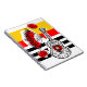 Whimsical design drawn in a retro style featuring souvenirs from a Spanish holiday; a wrought iron guitar, lacy fan and red rose on a striped background. A customisable design in black, white, red and golden yellow for you to personalise with your own text, images and ideas. An original digital art image.