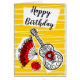 Whimsical design drawn in a retro style featuring souvenirs from a Spanish holiday; a wrought iron guitar, lacy fan and red rose. A customisable design in black, white, red and golden yellow for you to personalise with your own text, images and ideas. An original digital art image.