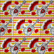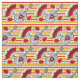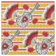 Whimsical design drawn in a retro style featuring souvenirs from a Spanish holiday; a wrought iron guitar, lacy fan and red rose, on a decorative striped background. A customisable design in black, white, red and golden yellow for you to personalise with your own text, images and ideas. An original digital art image.