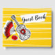 Whimsical design drawn in a retro style featuring souvenirs from a Spanish holiday; a wrought iron guitar, lacy fan and red rose. A customisable design in black, white, red and golden yellow for you to personalise with your own text, images and ideas. An original digital art image.