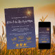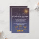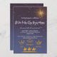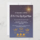 Celebra el Día de los Tres Reyes Magos con esta elegante invitación para cena del Día de Reyes en español. El diseño presenta un hermoso cielo nocturno azul oscuro con estrellas brillantes, creando una atmósfera mágica. En la esquina superior derecha, la Estrella de Belén brilla intensamente, guiando a los tres Reyes Magos que se muestran en la parte inferior de la invitación, montados en camellos a través del desierto. Sobre la ilustración de los Reyes, hay tres coronas reales que simbolizan los regalos que llevaron al Niño Jesús: oro, incienso y mirra, escritos en español.