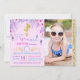Under the sea theme birthday invite design with gold glitter mermaid and tropical florals and seashells, seahorses, and coral reef watercolor effect with photo insert.