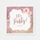 Faux rose gold sparkle glitter background and blush pink floral with "let's party" script in centre, elegant and stylish, great customised party napkins.