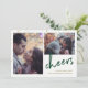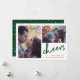 This modern holiday card features two of your personal photos, with faux gold sprinkles and the word "cheers" in elegant green handwritten script. The back of the card is green with more faux gold sprinkles.
