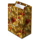 Glamourous Christmas gift bag with red and golden Christmas baubles, sparkling lights, tinsel and Christmas tree branches