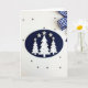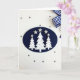 This card has three white Christmas trees covered in sparkly gems standing on a dark blue background with glittering stars on top. There's a fancy ribbon and a snowflake in the corner, adding to the holiday theme. The trees look like they're covered in frost or shiny ornaments, making them stand out. The background is simple white with grey polka dots, giving a fun touch to the design. The colors of navy blue, white, silver, and crystals make the card look elegant and festive, perfect for spreading holiday cheer.🎅🏼🎄🎁
