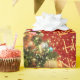 JOY, LOVE & PEACE - elegant Merry Christmas & Happy New Year wrapping paper with beautiful green Christmas tree decorated with colourful ornaments and sparkling lights over red background.
