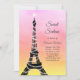 Sparkling twinkle lights accent the Eiffel Tower on a watercolor background in shades of pink, coral and yellow, making this Parisian Sweet Sixteen Invitation perfect for the Paris inspired party.