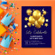 Elegant birthday invitation featuring gold balloons and sparkling stars on a navy blue back drop. Any age birthday invitation.