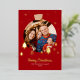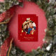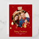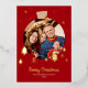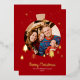 Elegant sparkling burgundy red Christmas holiday card. Design feature a Christmas tree ball photo frame with sparkling gold foil stars and pine tree. Name and message can be customised.