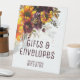 A modern and elegant burgundy and yellow sunflowers watercolor floral bouquet with it's shadow softly spilling onto this Gifts And Envelopes tabletop sign featuring sparkling gold splashes and elements, with your first names and date underneath in a modern font.