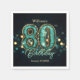 Celebrate eight decades in shimmering style! These vibrant 80th birthday paper napkins feature a captivating design of bold "80" numbers, rendered in a rich teal with elegant gold outlines and a scattered sparkle effect. Against a sophisticated dark background, subtle bokeh lights add a festive glow. Easily personalise the name and date for a truly unique touch.
