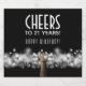 Cheers to 21 Years and Happy Birthday on a black background accent these sparkling wine bottle labels that feature the top of a sparkling wine bottle, a sparkler and blurred white lights. MATCHING items in our store.