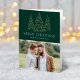 Modern & elegant holiday card featuring your photo complimented by three snowy faux gold foil pine trees with a green background (or color of your choice). "Merry Christmas" is displayed in a white, modern serif font with your name or custom text below. The inside of the folded holiday card features your custom message. The back of the card features an additional photo.