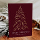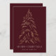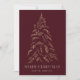 Modern & elegant holiday card featuring a snowy faux gold foil pine tree with a burgundy background (or color of your choice). "Merry Christmas" is displayed in a white, modern serif font with your name or custom text below. The non-photo holiday card reverses to display three golden pine trees with your custom message below in white text. This design is perfect to use as your family Christmas card or business/corporate holiday card.