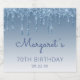 These chic seventieth birthday sparkling wine bottle labels feature a sparkly blue faux glitter drip border and blue ombre background. Personalise them with her name in blue handwriting script, with her birthday and date below in sans serif font.