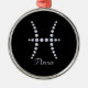 Sparkly glam ornament features the zodiac / astrological symbol for Pisces in diamond rhinestones on black background with script text