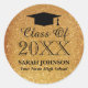 Sparkly faux gold graduation stickers and seals. Custom graduation stickers with black graduate hat / cap. Stylish round favor stickers with customizable year 2025 etc. Classy icon with name of grad plus date. Personalized thank you stickers, favor labels, envelope sealers / seals. Elegant script typography. Glamorous glossy design with golden sparkles and fancy text template. Customizable background color. Suitable for high school, college, university etc. Also good for school reunion parties. Add your own name, monogram, date etc.
