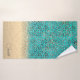 On this stylish towel set is a gold metallic sheen on the bottom of the large towel where you can personalise it then a glittery gold pattern that blends into a glittery silver leopard print with a turquoise backdrop for extra pop. Glam chic vibes.
