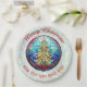 Bright and vibrant stained glass design of a multicolored Christmas tree in a red frame. With pale green glitter background and "Merry Christmas" (customisable). You can change the text at the bottom of the design to your own message.