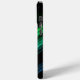 Sparkly metal neon aqua green galaxy chevron Monogram iPhone 15 Case. Personalise with your initial and name. Abstract sparkly metallic black green and blue galaxy stripes lines digital design. No actual sparkles!