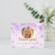 Express gratitude after a magical birthday celebration with this thank you postcard! Featuring a beautiful personalized photo of your child, surrounded by dreamy purple watercolor bubbles and shimmering silver stars. This whimsical design is perfect for a girl's birthday party, making guests feel appreciated for their presence and gifts. Easily customize with your own photo and message to create a memorable keepsake. A truly special way to say 'thank you' for the best birthday ever!