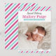 Announce your baby girl in style with these vintage inspired photo birth announcement cards features a special delivery airmail theme, hot magenta pink, aqua blue & white diagonal striped border, and charcoal grey round stamp design.