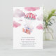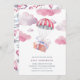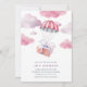 Our sweet watercolor baby shower invitations feature a wrapped present floating down on a striped parachute through fluffy pink and lavender clouds. Personalise with your baby shower details beneath. Cards reverse to a pattern of vintage biplanes and parachutes.