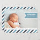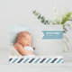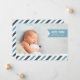 Add your favorite landscape oriented newborn photo to this modern full-bleed announcement and share your joy with friends and family. Design features your baby boy's name, birthdate and birth stats on a sky blue ribbon banner, with your family greeting displayed atop a bottom border of diagonal stripes in white, navy and sky blue.