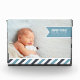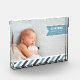 Add your favourite landscape orientated newborn photo to this modern acrylic photo block for a unique way to remember and display your baby's arrival. Design features your baby boy's name, birthdate and birth stats on a sky blue ribbon banner, with a bottom border of diagonal stripes in white, navy and sky.