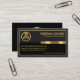 A rectangular gold border encapsulates a grey and black layer with a gold tab near the centre. Riding on this gold tab of success is your prestigious name and job title with a gold chauffeur logo you can use on the left. Just below all this, in the black layer, lies the business name, its contact details and a slogan caption (which you can change) at the lower right corner.