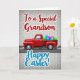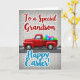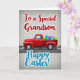 This card features a classic-style crimson pickup truck shown in profile, set against a lightly textured pale gray brick wall, rolling along a dark road marked with short white dashes. In the truck bed sits a stack of oversized egg shapes in lime green, bright blue, and magenta, some finished with thin stripes and a glossy shine 🐰. The scene feels friendly and affectionate, like a small surprise being delivered, with the truck angled forward as if heading straight to someone special. Near the top, the line “To a Special Grandson” appears in red lettering with a thin white outline, centered above the artwork. Near the bottom, “Happy Easter!” is placed large in turquoise with a white outline, standing out strongly against the neutral background 🌷. The rich red truck contrasts with the pastel eggs, giving the whole layout a festive look without feeling busy. The pale brick pattern stays soft and even behind everything, letting the truck, eggs, and lettering remain the focus. The road runs horizontally beneath the truck, with evenly spaced white dash marks cutting across the dark surface.
