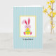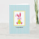 This card features a stylized light pink bunny sitting front and center 🐰, with tall ears tipped upward and warm red shading inside them. Its tiny dot eyes and small paws give it a sweet, friendly look, as if it’s shyly offering a gift to someone it cares about. Held close against its chest is a bright yellow egg-shaped treat decorated with a sky-blue band and two matching blue dots, like a little present meant for a close friend. The illustration sits inside a white rectangle bordered by a soft, scalloped yellow frame that feels like a gentle ribbon around the scene 🌷. Beneath the framed picture, the text “To a Special Little Girl!” appears centered in a casual handwritten look, set in a dark ink tone for easy reading. Behind everything, the background is pastel blue with uneven vertical white stripes that resemble soft fabric. The bunny’s pink body contrasts with the buttery yellow border, and the egg’s blue accents echo the pale blue field around it. The pastel blue background is patterned with irregular white vertical stripes stretching from top to bottom.