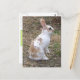 A speckled bunny rabbit sits at attention, while having his photo taken.