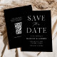 Announce your upcoming nuptials in style with our elegant, modern QR code save the date card. The non-photo save the date features "Save the Date" in white serif and script fonts with a black background with subtle white specks. Personalise the front of the save the date card by adding your names, wedding date, wedding location, and other wedding details. The minimal save the date card reverses to feature your custom QR code with wedding website and custom text. Perfect save the date for both modern formal and casual weddings!