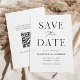 Announce your upcoming nuptials in style with our elegant, modern QR code save the date card. The non-photo save the date features "Save the Date" in black serif and script fonts with a white background with subtle black speckles. Personalise the front of the save the date card by adding your names, wedding date, wedding location, and other wedding details. The minimal save the date card reverses to feature your custom QR code with wedding website and custom text. Perfect save the date for both modern formal and casual weddings!