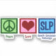 Speech language pathologist sticker that reads PEACE LOVE SLP for a speech therapist who works in speech language pathology to help others speak.