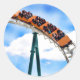 Photograph of an orange roller coaster speeding along the track against a light blue sky
